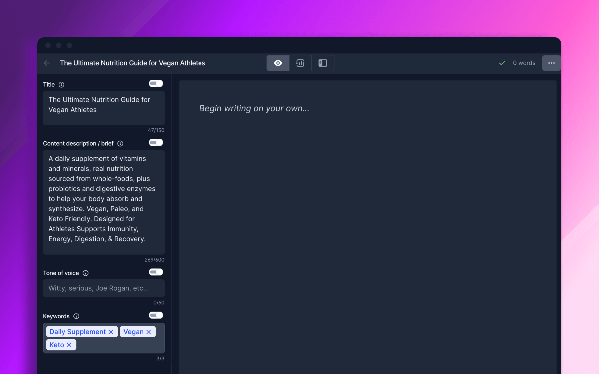 Say "Hey!" to Jarvis. Your AI writing assistant makes it fast & easy to create content for your blog, social media, website, and more!